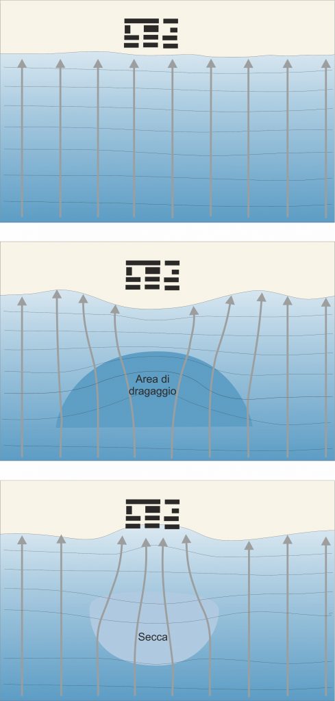 Condizioni originarie (in alto), dragaggio riconfigurazionale e ripascimento (al centro), secca convergente (in basso).