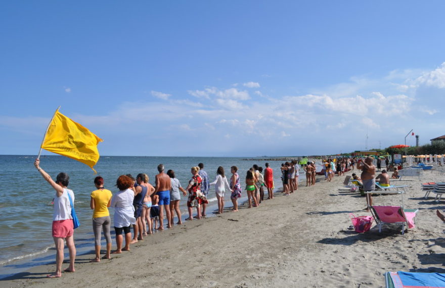 Una lunga catena umana a simbolica protezione della costa che si sta inesorabilmente abbassando: è il blitz realizzato questo pomeriggio presso la spiaggia del Lido di Dante (Ravenna) da Legambiente e il Comitato Cittadino in occasione dell’arrivo di Goletta Verde in Emilia-Romagna. Bagnanti, cittadini, commercianti e operatori turistici uniti per porre