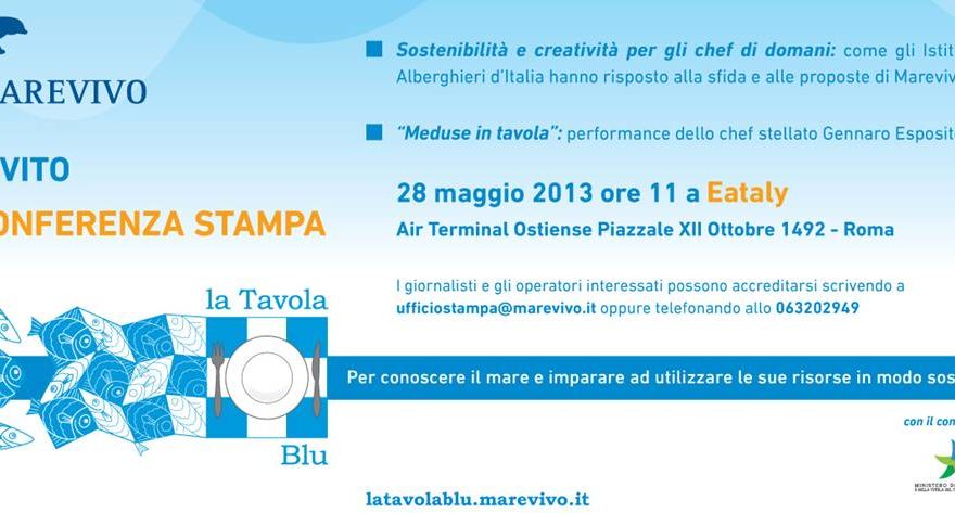 L’associazione ambientalista Marevivo organizza "La tavola blu", un’iniziativa per conoscere il mare e imparare a utilizzare le sue risorse in modo sostenibile. L’appuntamento è per il 28 maggio 2013 ore 11 a Eataly (air terminal Ostiense, piazzale XII Ottobre 1492, Roma). Due gli eventi che animeranno la giornata: