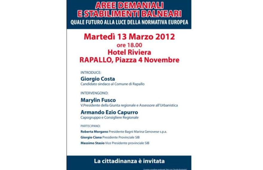 AREE DEMANIALI E STABILIMENTI BALNEARI: quale futuro alla luce della normativa europea Martedì 13 marzo 2012, ore 18.00, presso Hotel Riviera (piazza 4 Novembre, Rapallo) Introduce Giorgio Costa (candidato sindaco al Comune di Rapallo). Intervengono Marylin Fusco (vicepresidente della Regione Ligura e assessore regionale all’urbanistica) e Armando Ezio
