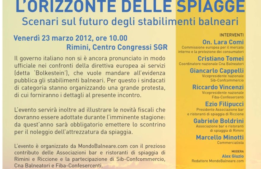 Domani alle ore 15.30, presso l’Hotel Villa Corallo di San Benedetto del Tronto, si terrà un incontro organizzato dall’Itb Italia per fornire ai balneari gli ultimi aggiornamenti in merito alla direttiva Bolkestein, che vuole mettere all’asta le concessioni demaniali marittime, e alle novità fiscali dell’estate 2012, che sarà