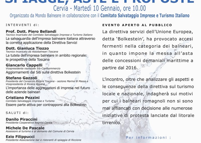 ‘IMPRESE BALNEARI ANNO 2012 – Dai ripascimenti stagionali al futuro delle nostre concessioni‘. Questo il titolo dell’evento in programma venerdì 27 gennaio alle ore 10 a Spotorno (Savona), presso il Pala Beach Village (via Serra 41), organizzato dai quattro principali sindacati balneari (Sib-Confcommercio, Fiba-Confesercenti, Cna