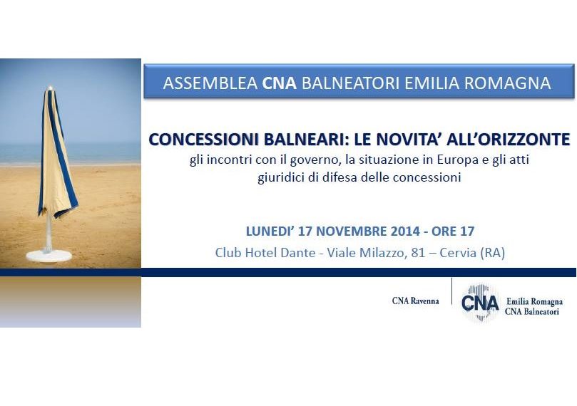 Si terrà lunedì 17 novembre 2014 alle ore 17 l’assemblea regionale di Cna Balneatori Emilia-Romagna, in programma al Club Hotel Dante di Cervia (viale Milazzo 81), intitolata "Concessioni balneari: le novità all’orizzonte". L’appuntamento ha lo scopo di fare il punto sugli incontri con il governo, la situazione in Europa e