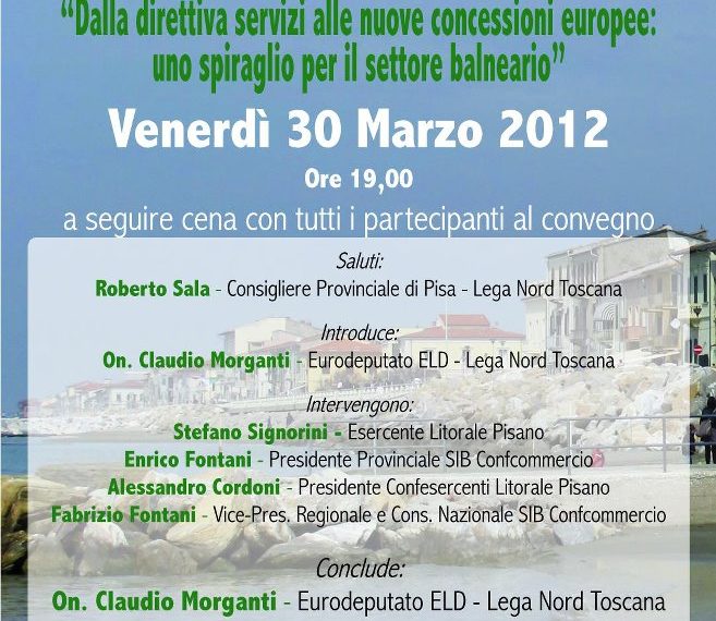 Dalla direttiva servizi alle nuove concessioni europee: uno spiraglio per il settore balneario Venerdì 30 marzo 2012, ore 19.00, presso Ristorante Barbarossa (via Litoranea 8, Marina di Pisa) Saluto di Roberto Sala (consigliere provinciale di Pisa per Lega Nord Toscana) Introduzione di Claudio Morganti (Eurodeputato ELD, Lega Nord Toscana) Interventi di Stefano