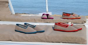 Sulla spiaggia di Lignano Pineta, in Friuli, le tele di ombrelloni e lettini si riciclano per essere trasformate in calzature alla moda. In un mondo