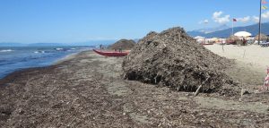 Una ingente quantità di “lavarone” è stata accumulata domenica mattina da una mareggiata sulla spiaggia di Viareggio, nella zona della passeggiata. Si tratta del miscuglio