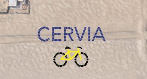 È una bicicletta gialla di 75 metri quella che, insieme alla parola “Cervia” in blu, campeggia sulla spiaggia libera del lungomare di Cervia per strizzare