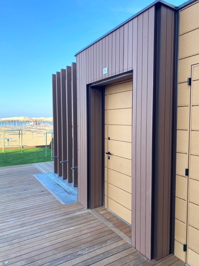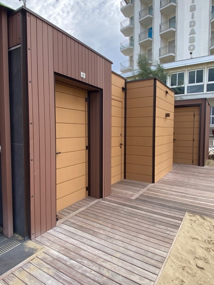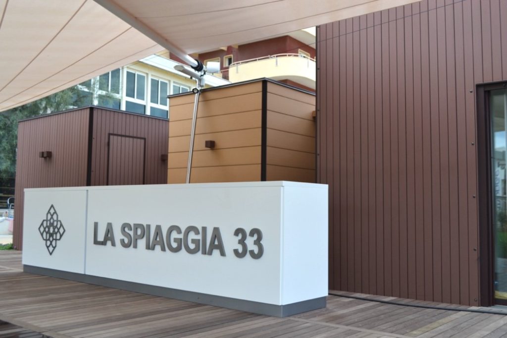 Spazi ampi e dedicati, architetture piacevoli, concepite per giocare col sole e con le ombre. Un luogo dove tutto è armonia con la natura, col sole, con la sabbia e col mare. GB Technology ha eseguito le lavorazioni per il frangisole decorativo, realizzato in alluminio e HPL, vero e proprio simbolo dello stabilimento che richiama il logo dalla fantasia “esotica”.