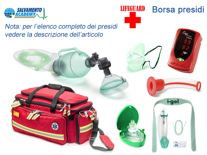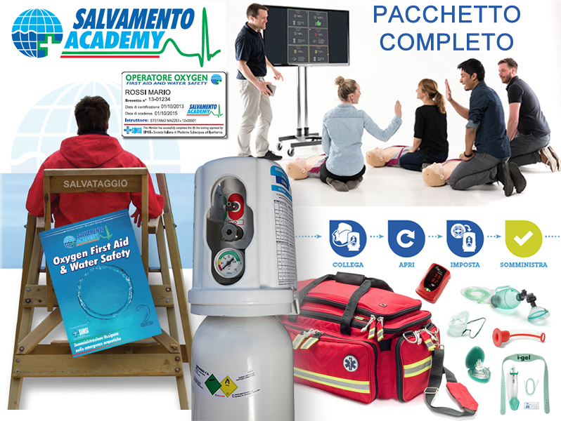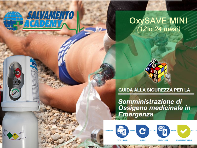 Course “Oxygen First Aid and Water Safety”: theoretical and practical training in front of the classroom at the customer’s headquarters on the administration of oxygen in emergency with qualified instructor up to 4 people (duration 4 hours) with training on electronic dummies, including teaching kit and issuing certification and patent + OxySAVE mini (24 months) + Bag protections.