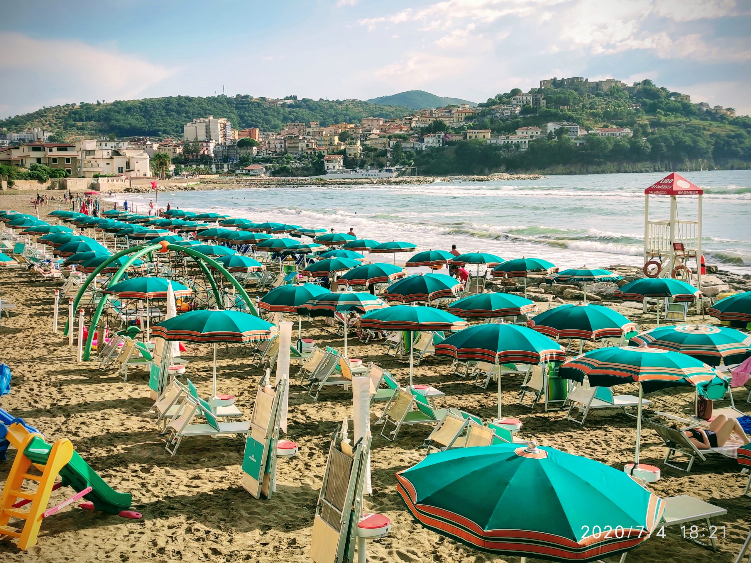 La spiaggia, ampia e sabbiosa, è piena di ombrelloni, sdraio e lettini e affaccia su un mare cristallino da Bandiera Blu.