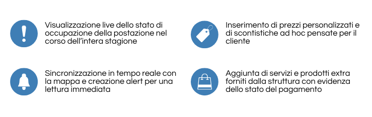 L’aggiornamento in tempo reale della mappa consente di individuare immediatamente le postazioni occupate, le prenotazioni in scadenza e lo stato dei pagamenti.