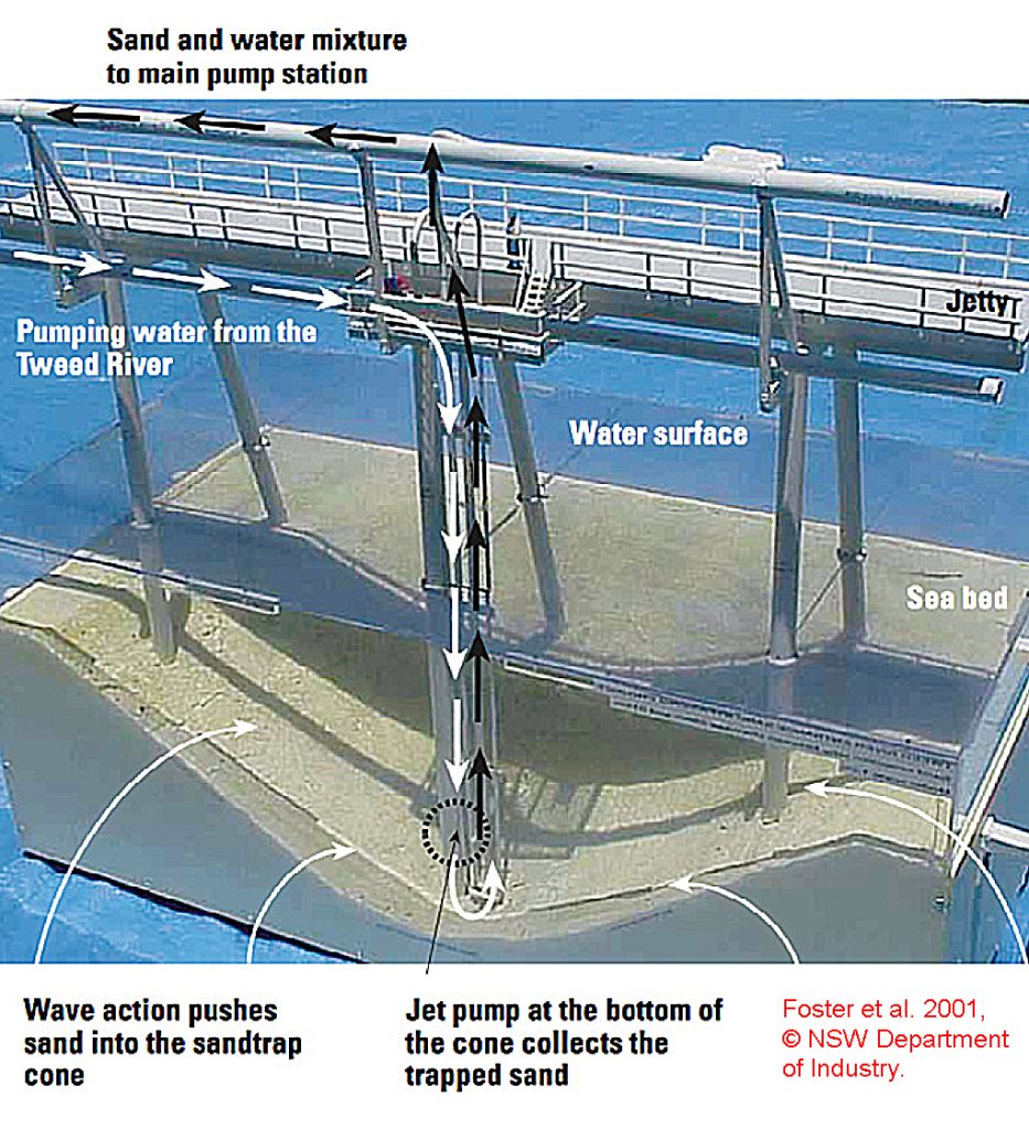 Il primo bypass fisso di grande potenza è quello che iniziò a operare nel 1986 alla foce del Nerang River (Southeast Queensland, Australia), che prima di entrare in mare attraversa un’ampia laguna che ospita porti turistici e commerciali. Per tenerne aperta l’imboccatura furono costruiti due moli guardiani, con quello di sopraflutto lungo 400 metri, che sarebbe andato a intercettare un trasporto sedimentario di 500.000 m3/anno; di gran lunga superiore a quello presente lungo le nostre coste. Circa 250 metri sopraflutto al primo molo è stato costruito un pontile lungo 500 metri sul quale operano 10 pompe che aspirano la sabbia dal fondale e la immettono in una condotta che la trasferisce sulle spiagge poste sottoflutto, quelle della Gold Coast, una zona turistica di grandissimo valore. Nei primi trent’anni di attività ha spostato 16 milioni di m3 di sedimenti.