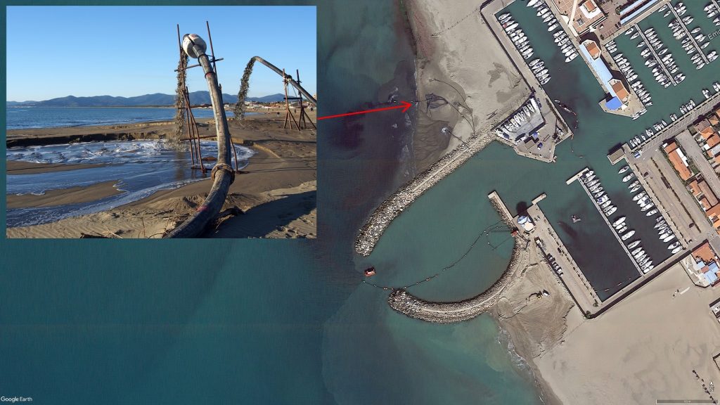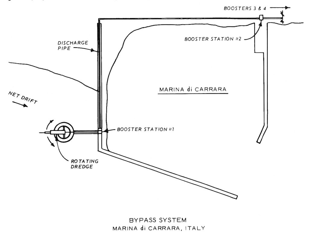 In Italia non solo questi sistemi non vengono installati quando emerge la necessità, ma si hanno casi in cui sono stati dismessi e demoliti. La Toscana ne è un esempio, con il bypass del porto di Viareggio e con quello del porto di Marina di Carrara. Quest’ultimo è presente nella letteratura scientifica grazie a un articolo di T. Richardson, pubblicato sugli atti del convegno “Coastal sediments” tenutosi a Charleston, South Carolina, nel 1977. Nell’articolo si legge che il porto aveva indotto un’erosione su 5 miglia di litorale e il sistema di bypass, attivato nel 1968, trasportava la sabbia per 4 miglia, potendo refluire circa 100 m3 ogni ora. La sezione iniziale del tubo poggiava su una piattaforma circolare che consentiva una rotazione di 320°. L’autore afferma che il sistema aveva assolto pienamente il proprio compito e che nel periodo di attività non si erano mai registrati problemi di insabbiamento della tubazione.