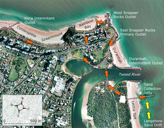 Un bypass simile lo troviamo 30 km più a sud, alla foce del Tweed River (2001), anche qui per tenere aperta la bocca della laguna attraverso la quale entrano anche navi di grande pescaggio. La tubazione raggiunge diversi punti della costa e il rilascio della sabbia viene deciso sulla base delle necessità dalle varie spiagge. Qui non sono solo i moli guardiani a essere trasparenti, ma anche tutta la gestione del sistema, con la pubblicazione su internet in tempo reale dei volumi dragati e della loro distribuzione nei vari punti della costa. È in fase di realizzazione anche una nuova condotta per refluire 300.000 m3/anno verso sud, in un tratto soggetto a forte erosione.
