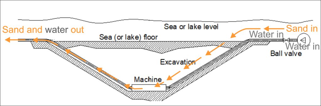 Una soluzione innovativa, seppure limitata a tenere libero il canale di accesso, è stata testata in alcuni porti dell’Emilia-Romagna ed è operativa a Cattolica dal 2018. Diversi tubi raggiungono l’asse del canale e sparano l’acqua sul fondale, mettendo in sospensione i sedimenti che formano una miscela liquida, immediatamente aspirata e portata sottoflutto da una tubazione. Il tutto avviene in un dispositivo, l’eiettore, sperimentato dall’Università di Bologna anche nell’ambito di un progetto europeo LIFE coordinato da Trevi spa, mediante un impianto realizzato in vera scala in un porto della costa romagnola (per maggiori informazioni: https://www.lifemarinaplanplus.eu/it/).