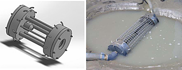 Il progetto ricorda quello che Douglas L. Inman stava sviluppando nel 1986 per mantenere una determinata profondità nei canale che separano le isole barriera della costa atlantica degli Stati Uniti e garantire il passaggio dei sommergibili nucleari in immersione per raggiungere le basi nella laguna. Si trattava di un tubo forellato (come un piffero!) immerso sul fondo e dal quale, con la marea calante, veniva fatta uscire acqua in pressione. La turbolenza metteva in sospensione i sedimenti che il flusso di marea spingeva poi verso il mare aperto. Delle catene fissate sui bordi del canale consentivano un graduale affondamento fino al raggiungimento la profondità richiesta.