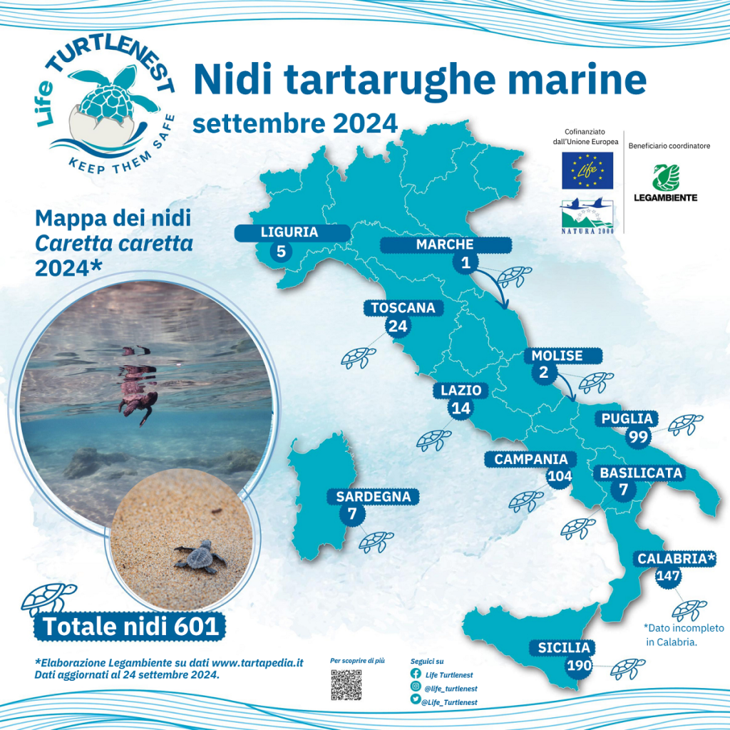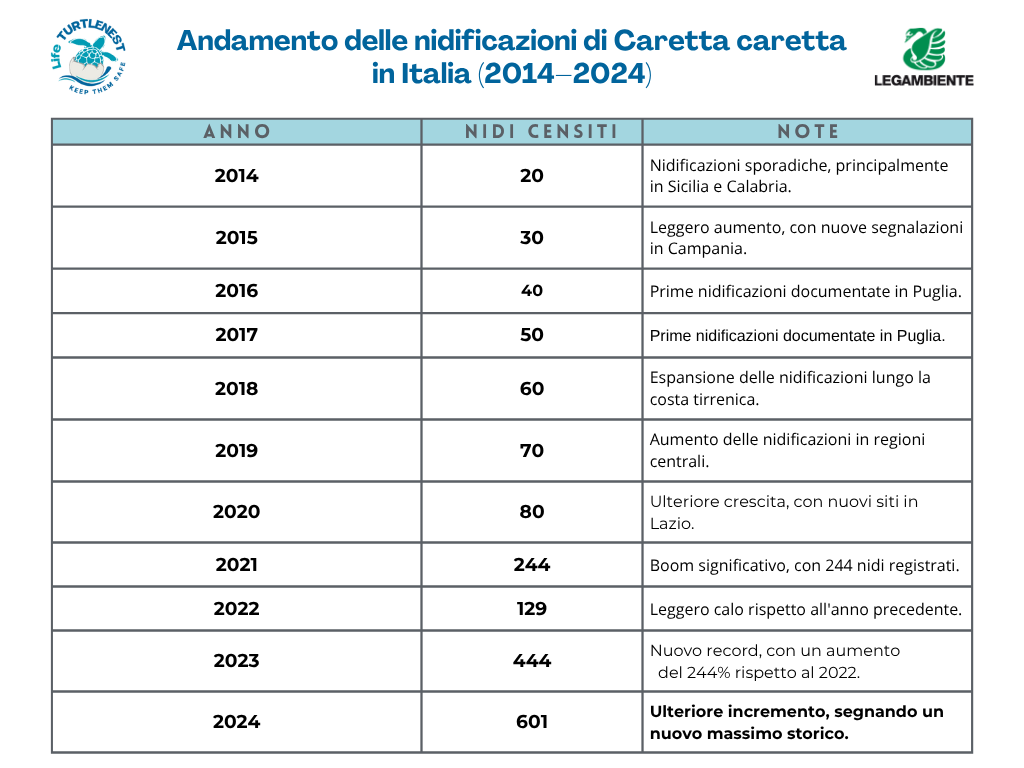 In Italia questa crescita non riguarda solo la frequenza, ma anche la distribuzione geografica dei nidi, che si estende ormai dalle regioni meridionali fino a quelle settentrionali. Lazio, Toscana, Liguria e persino tratti meno noti del litorale adriatico stanno registrando tentativi di nidificazione che fino a pochi anni fa sarebbero stati impensabili. Località come il Delta del Po o la Riviera ligure cominciano a comparire nei rapporti di monitoraggio, evidenziando come la specie stia esplorando e colonizzando ambienti nuovi. In particolare, dei 601 nidi censiti nel 2024, (190 erano stati trovati in Sicilia, 147 in Calabria, 104 in Campania, 99 in Puglia, 24 in Toscana, 14 nel Lazio, 8 in Sardegna e 5 in Liguria).