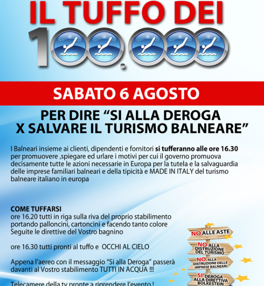 Manca poco al grande tuffo dei centomila: questo sabato gli operatori balneari di tutta Italia alle ore 16.30 faranno un simbolico bagno in mare per protestare contro la direttiva Bolkestein che da lunghi mesi sta angosciando il lavoro di migliaia di persone. Il manifesto dell’iniziativa, lanciata dal sito Stops.it, parla chiaro: "Balneari, clienti, dipendenti e