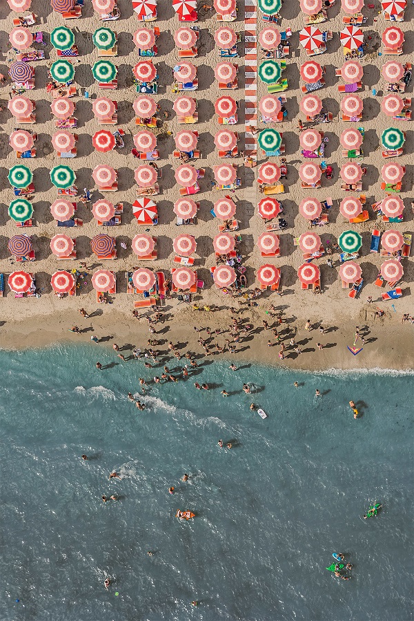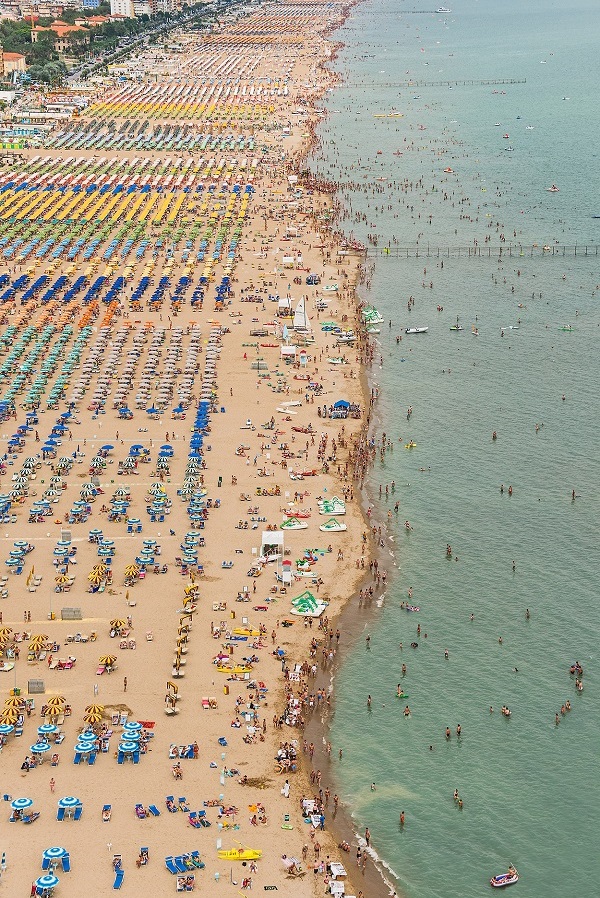 Le immagini aeree dell’artista tedesco Bernhard Lang, con la loro visione dall’alto quasi ipnotica, restituiscono tutta la potenza visiva di questa organizzazione minuziosa. File ordinate di lettini e ombrelloni colorati diventano pattern geometrici, moderni mosaici mediterranei. È proprio da questo punto di vista che il Romagna Classic svela la sua essenza: una bellezza funzionale, democratica e rigorosa, dove ogni dettaglio è pensato per l’equilibrio tra uomo, natura e ospitalità.