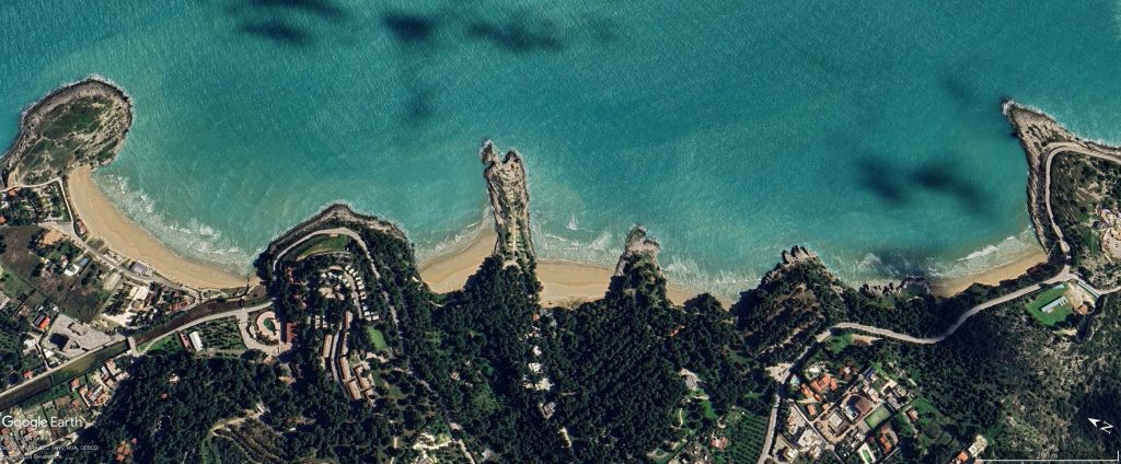 La realtà è assai più complessa di come possa apparire dai nostri disegni, anche perché un ruolo fondamentale sulla progressione delle onde lo gioca la morfologia del fondale, e la rifrazione si somma a diffrazione e riflessione. Ecco quindi che le spiagge di baia possono assumere forme diverse, e viaggiando lungo le coste del mondo, magari solo grazie a Google Earth, ci possiamo trovare davanti a puzzle affascinanti. Ma vogliamo rimanere sul Gargano, dove la natura si è divertita a disegnare delle spiagge improbabili: in pochi chilometri si trovano tantissime pocket beach dalle forme più svariate. Lasciamo a voi il piacere di risolvere questi puzzle.