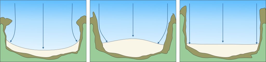 Spiagge di questo tipo non si trovano mai in golfi dove i promontori tendono a chiudere l’insenatura, perché in questi casi l’effetto della diffrazione delle onde è dominante e la spiaggia s’incurva verso l’interno (come nella figura di sinistra, nell’immagine qui sotto). Se invece i due promontori hanno un andamento divergente (a V) e le onde hanno una direzione in asse con il golfo, queste potrebbero venire riflesse da entrambe le pareti rocciose e creare un flusso d’acqua convergente al centro della baia che, trasportando la sabbia, potrebbe formare una bombatura (nella figura al centro). All’interno d’insenature strette e lunghe, e con fianchi rettilinei, in alcuni casi si possono formare spiagge lineari (nella figura a destra), anche se un minimo di curvatura la presentano sui bordi, all’attacco con le pareti rocciose. Questo perché qualche rugosità può sempre produrre un minimo di rifrazione, e comunque le onde, rallentando per l’attrito con i fianchi del golfo, s’incurvano esse stesse.