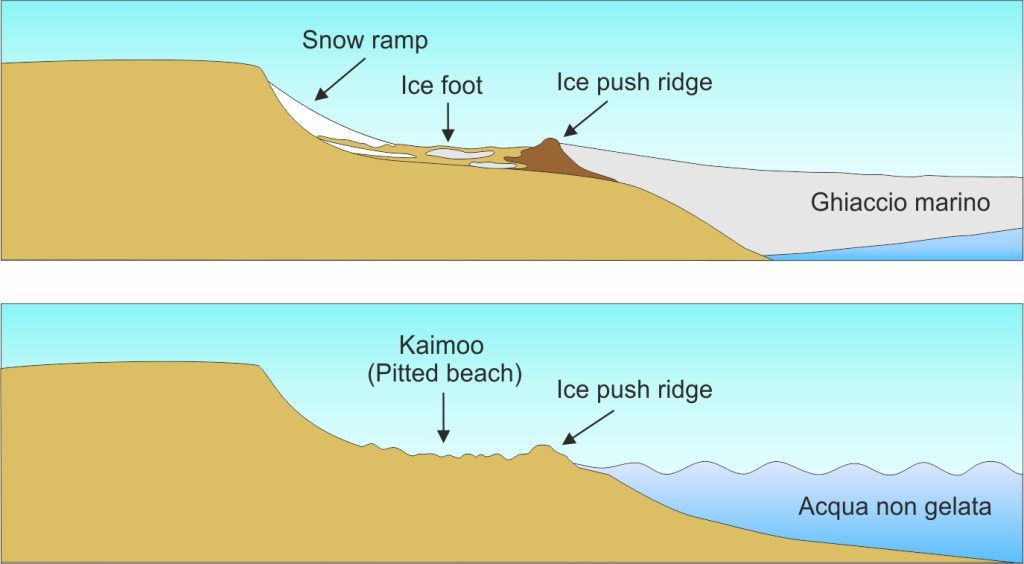 Questi cordoni elevati, presenti anche sulle nostre spiagge, non vanno confusi con una morfologia esclusiva delle coste dominate dal ghiaccio, gli ice push ridges (cordoni spinti dal ghiaccio). Questi si formano in particolare all’interno delle insenature, perché l’acqua gelando aumenta di volume e si espande anche verso terra, raschiando sul fondale e, come un bulldozer, accumulando i sedimenti lungo la linea che riesce a raggiungere.