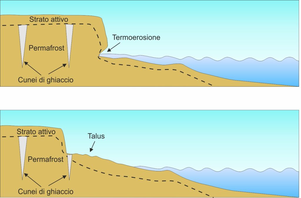 La presenza di ghiaccio nei pori dei sedimenti non consolidati conferisce loro una maggiore resistenza nei confronti dell’azione del moto ondoso e permette lo sviluppo di ripide scarpate di erosione marina in depositi nei quali, in assenza di ghiaccio, si formerebbero pendii a debole pendenza. Nelle zone in cui vi è il permafrost, il ghiaccio è presente anche in forma di cunei, la cui spinta laterale può determinare il crollo dei blocchi di suolo e l’arretramento della scarpata per eventi catastrofici. Ciò è favorito anche dalla formazione, alla base della scarpata stessa, di nicchie prodotte dalla fusione del ghiaccio interstiziale (come i nostri solchi di battente) che viene a trovarsi a contatto con l’acqua marina (termoerosione).