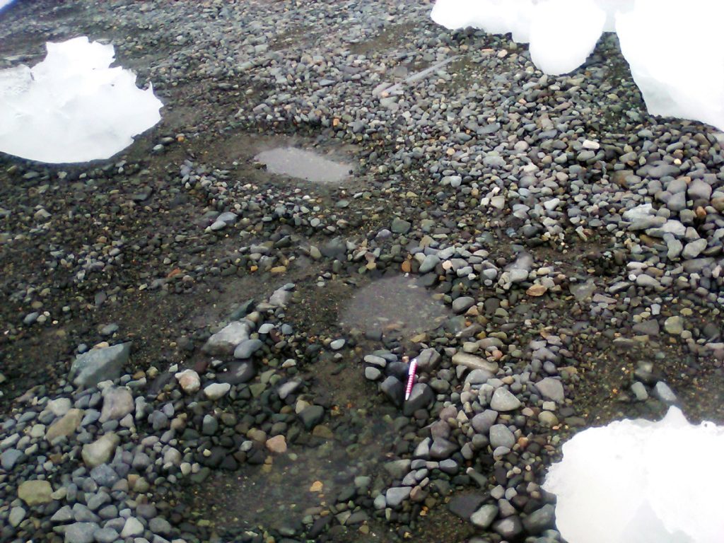 In primavera, con la fusione dei livelli di ghiaccio presenti nel corpo della spiaggia, si ha il collasso delle strutture sedimentarie e la formazione di una superficie estremamente rugosa, per la quale è entrato in uso il termine eschimese inuit di kaimoo (nella figura qui sopra). Su questa superficie si possono trovare anche delle piccole depressioni dovute alla fusione dei blocchi di ghiaccio spiaggiati nell’autunno precedente ed eventualmente inglobati nei sedimenti: ecco la formazione delle pitted beaches (“spiagge bucherellate“).