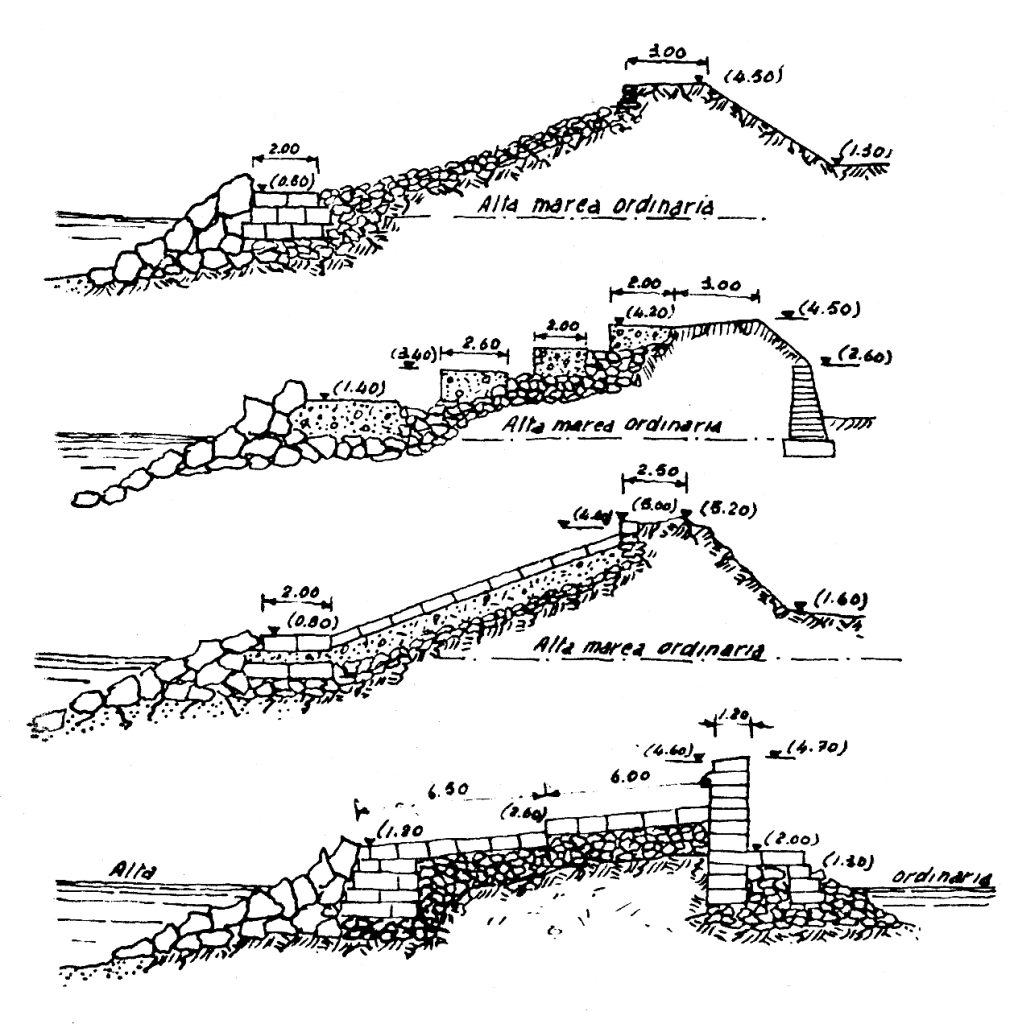 I profili che hanno avuto i murazzi di Venezia nel tempo e nei diversi settori del litorale, in un disegno tratto da “La difesa delle spiagge e delle coste basse” di Ettore Gallareto.