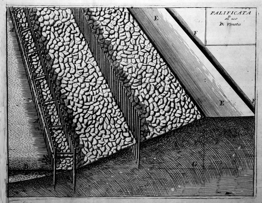 Alla fine del XVII secolo a Venezia la difesa esterna veniva affidata a una struttura pressoché continua, costruita con pali di legno, fascine e pietre. Un’opera qui estremamente raffinata, ma certamente in uso anche lungo altre coste del mondo.