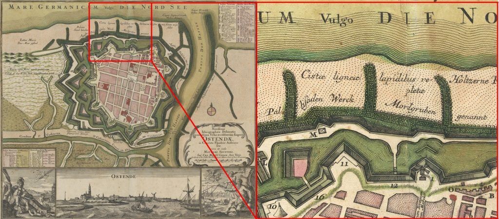 Scogliere aderenti e pennelli costituiti da cistae ligneae lapidibus repletae in una carta di Ostenda disegnata da Joan Blaeu nel 1649.