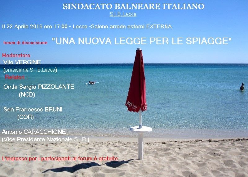 Il Sib-Confcommercio Lecce organizza il forum di discussione su “Una nuova legge per le spiagge”, in programma venerdì 22 aprile alle ore 17, al salone dell’arredo per esterni Externa. Interverranno all’incontro il deputato Sergio Pizzolante (Nuovo Centrodestra), il senatore Francesco Bruni (Conservatori e riformisti) e l’avvocato Antonio