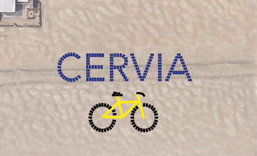 È una bicicletta gialla di 75 metri quella che, insieme alla parola “Cervia” in blu, campeggia sulla spiaggia libera del lungomare di Cervia per strizzare l’occhio al passaggio del Tour de France. L’installazione, grande 75×80 metri, è stata realizzata dalla Cooperativa bagnini di Cervia per celebrare la Grand Bouclé presso il chilometro zero della