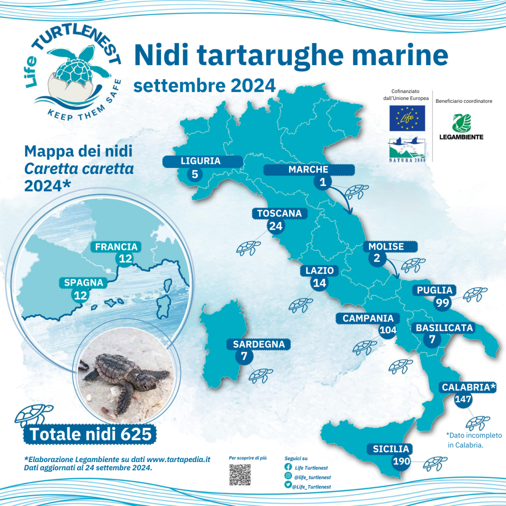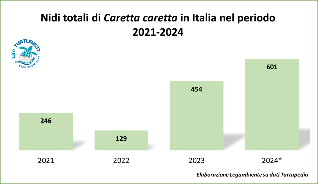 Il 2024 segna un nuovo record per le nidificazioni della tartaruga marina Caretta caretta in Italia. Sulle nostre coste si è registrata la bellezza di 601 nidi, il dato più alto mai raggiunto. Un risultato straordinario, frutto del lavoro costante di monitoraggio e protezione dei nidi svolto da centinaia di volontarie e volontari, grazie anche al progetto Life Turtlenest, cofinanziato dal programma europeo Life, che mira a proteggere i siti di ovodeposizione della tartaruga marina sulle coste mediterranee di Italia, Spagna e Francia.