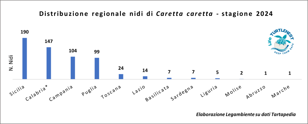 In testa alla classifica del boom c’è la Sicilia con 190 nidi tra le province di Siracusa, Ragusa, Agrigento e Trapani. Segue la Calabria con 147 nidi, localizzati sulla Costa dei Gelsomini, in provincia di Reggio Calabria e sul litorale tirreno, anche se mancano ancora all’appello i nidi individuati dagli operatori del Wwf. La Campania si conferma la terza regione più gettonata da mamma tartaruga (104 nidi), specialmente sul litorale domizio-flegreo e nel Cilento. Sono 99 quelli rilevati in Puglia, concentrati per la maggior parte in province di Lecce. Sorprendenti anche i risultati della Toscana con 24 unità, localizzate principalmente sui litorali delle province di Lucca e Livorno. Nel Lazio sono stati trovati 14 nidi nelle località balneari di Ostia, Torvaianica e Tarquinia, ma anche tra Sabaudia, Nettuno e Terracina. 7 i nidi registrati in Sardegna, principalmente nella parte meridionale dell’isola, anche se non ne mancano nel nuorese, nel sud Sardegna e nel sassarese, così come in Basilicata. Chiudono la classifica la Liguria con 5 sulla costa di Savona e Imperia, il Molise con 2 unità, l’Abruzzo con un nido sulla costa teramana e le Marche con un unico caso sul litorale della provincia di Ascoli Piceno.